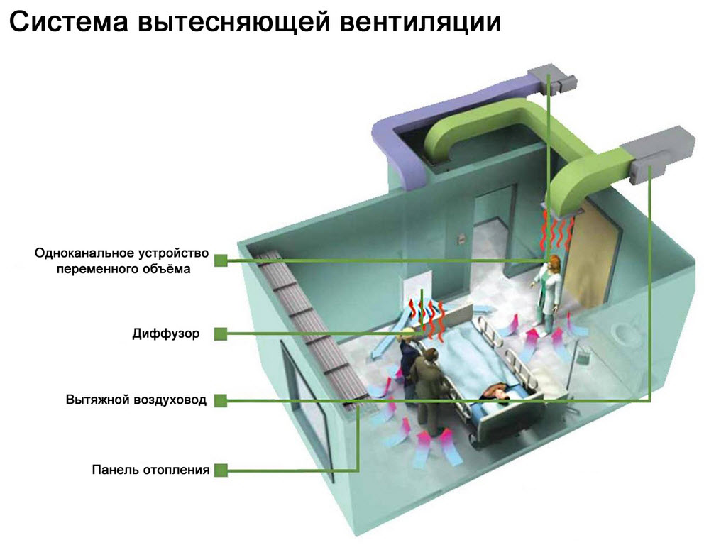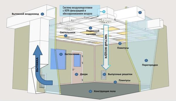 A atmosfera extremamente limpa em tais salas pode ser alcançada de uma maneira - o deslocamento das massas de ar existentes e o influxo de ar fresco com ar condicionado filtrado.