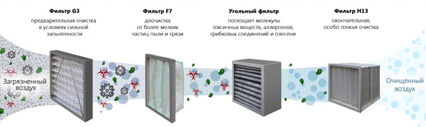 - Filtros de várias classes de limpeza. Frequentemente selecionado de acordo com os requisitos para um tipo específico de limpeza da sala. O esquema mais eficaz para remover partículas estranhas do ar de suprimento passando-o por 4 tipos de filtros - grosso, fino e de alta eficiência (Hepa) e hiperfina (ULPA) limpeza.