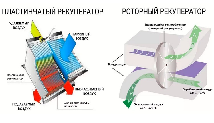 Dependendo do transportador de calor que aquece o ar, os recuperadores são água e glicol. Dependendo do tipo de trocador de calor dispositivos de recuperação são divididos em lamelar e rotor. Uma característica do rotativo é um trocador de calor de tambor rotativo e a ausência de congelamento.