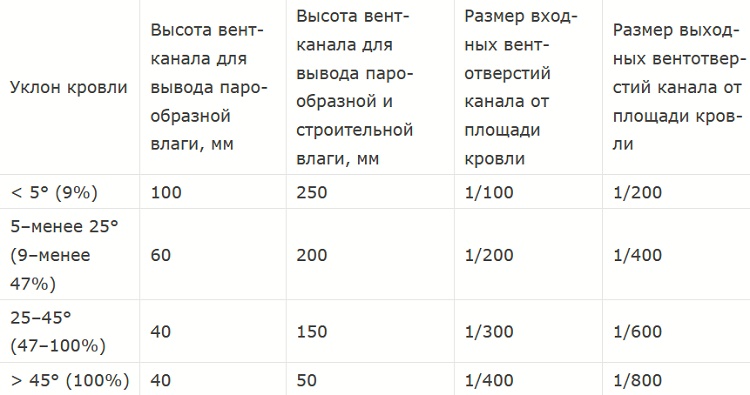 De acordo com o conjunto de regras para a instalação de coberturas SP17.13330.2011, os tamanhos dos dutos de ventilação para coberturas planas e inclinadas devem ser determinados por cálculo. No entanto, a diferença nos cálculos feitos, mesmo levando em consideração as diferenças nas condições climáticas e nos ângulos de inclinação do telhado, afeta levemente o resultado. Portanto, na maioria dos casos, tome valores médios.