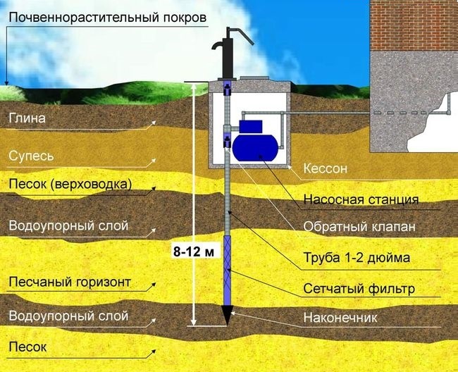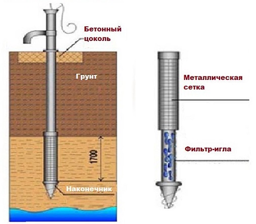 Uma maneira alternativa de adaptar uma agulha de entrada de água a um nível inadequado de água subterrânea é instalar um poço. Antes de colocar a coluna no chão, um poço é escavado com uma profundidade de cerca de um metro, a largura de uma pá conveniente para trabalhar nele. A direção da barra começa a partir do fundo do poço. A bomba nessas situações é instalada no poço.