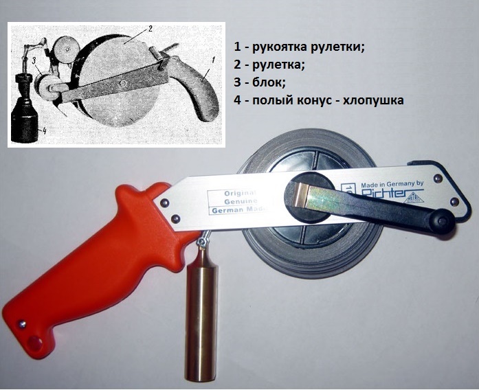 Este é um cilindro de metal oco chamado cracker. O dispositivo é como um vidro fino invertido preso através de um laço a uma fita métrica.