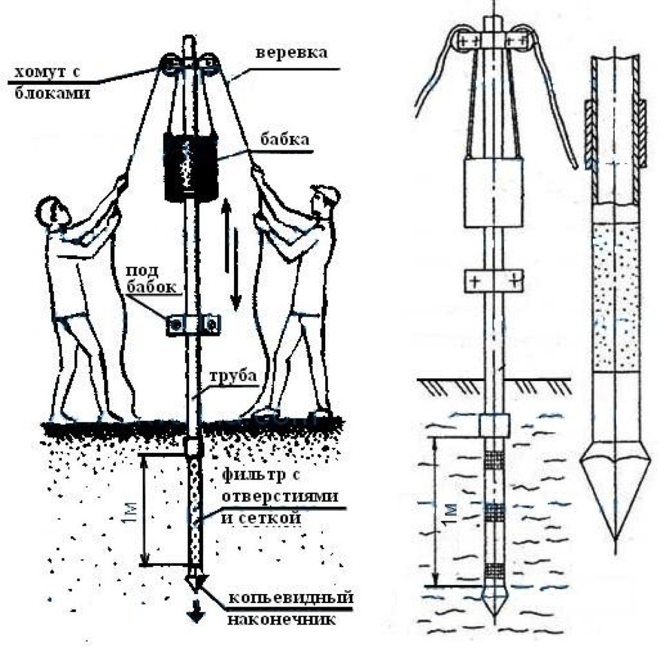 O método clássico de imersão no poço abissínio no solo é realizado por direção banal - a maneira mais simples, usada ativamente entre artesãos independentes. Entupir até que o tubo inferior com a ponta não abra o aqüífero.