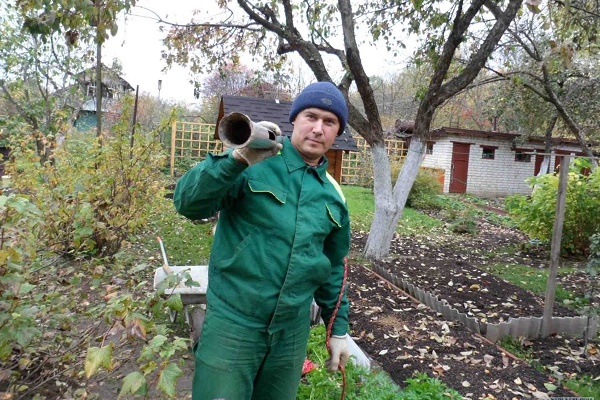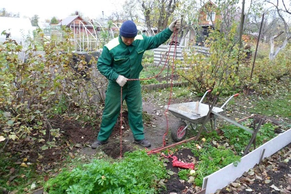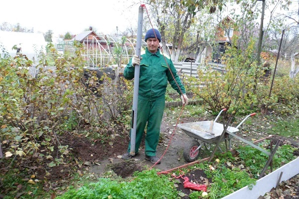Uma broca é imersa no recesso e, segurando a ferramenta pela alça, eles gradualmente começam a aparafusar no solo no sentido horário. Este trabalho é mais conveniente para fazer em conjunto: o primeiro rolará a alça da ferramenta e o segundo - para pressioná-la de cima.