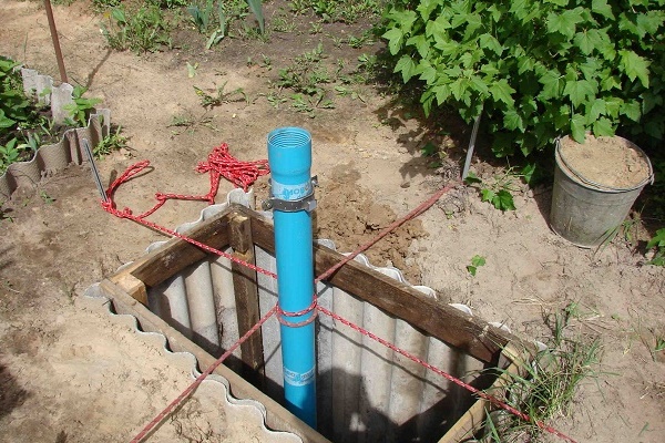 Ativado bem localização eles cavam um buraco com um tamanho de 150x150 cm. É necessário para garantir a estabilidade de um tubo instalado verticalmente. Para que as paredes do recesso não se esfacelem, elas são reforçadas por tábuas de corte ou pedaços de aglomerado.