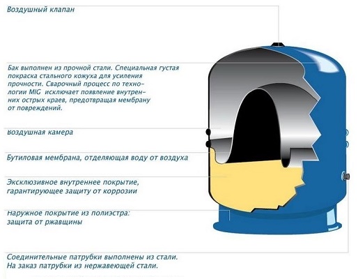 Lá fora, na verdade, é um tanque de metal, e dentro do recipiente é dividido em duas partes por uma junta de borracha especial, às vezes chamada de membrana.