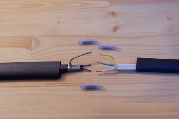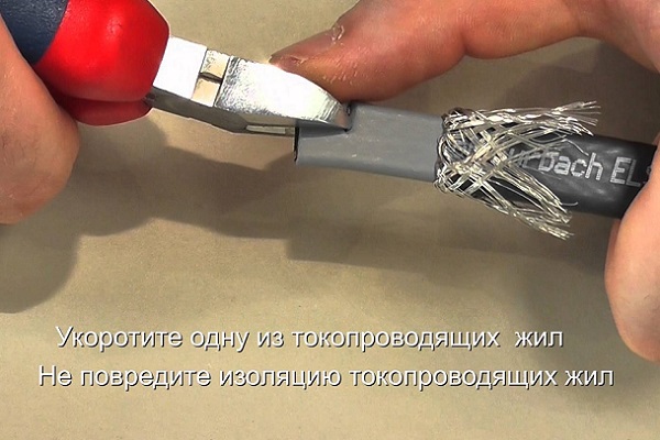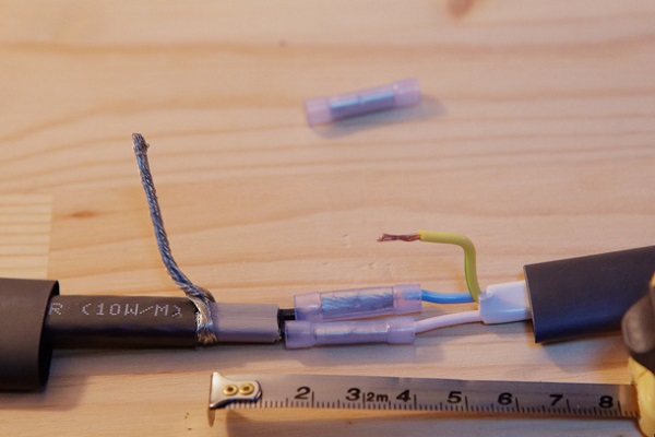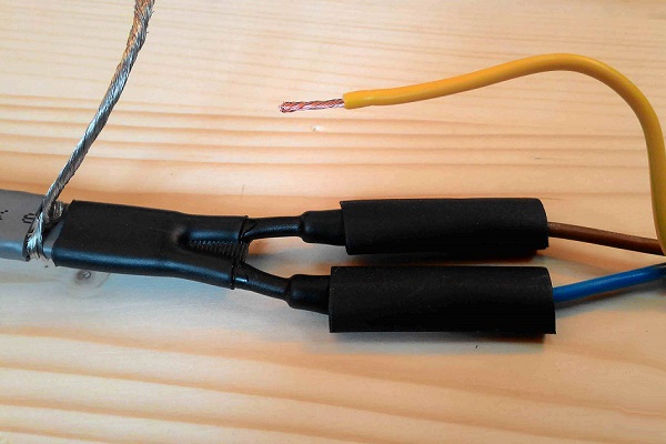 Depois de colocar a penetração no fio, você pode proceder à emenda com o cabo de alimentação. Se você adquiriu um kit pronto no qual um pedaço de cabo com um plugue na extremidade já está conectado, não é necessário esta etapa.