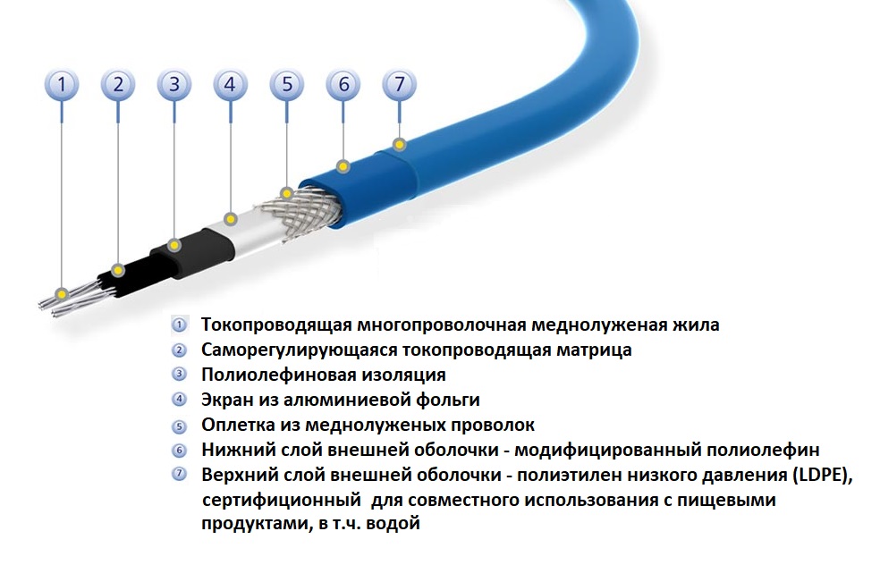 Se você quiser aquecer um cano que forneça água potável à sua casa, compre um cabo em uma jaqueta de comida. Todos os fabricantes e lojas devem indicar essa característica nos documentos anexos. Os requisitos de revestimento de cabos para sistemas de transporte de águas residuais e de água de processo não são tão rigorosos.