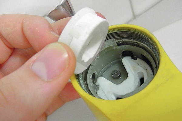 Le troisième. La cartouche est fermée par un couvercle décoratif qui doit être dévissé à la main. Sous le couvercle se trouve un grand écrou circulaire, qui est le principal problème pour ceux qui veulent changer la cartouche par eux-mêmes.