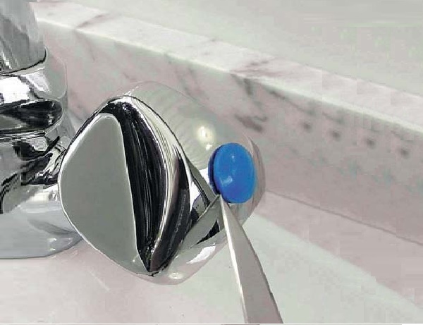 Le premier. Nous retirons un capuchon décoratif de couleur. Il sert non seulement à couvrir le boulon, mais indique également la position du levier lors de l'application d'eau froide et chaude.