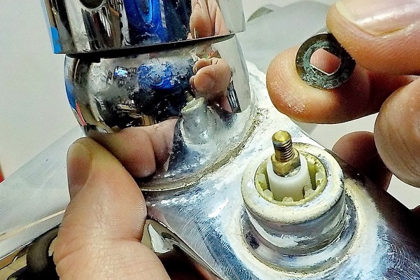 Après avoir remplacé le joint, tout doit être remis à sa place. Réinsérez la boîte d'essieu. Habituellement, lors du retrait des boîtes d'essieu, il est toujours conseillé de traiter la cavité interne de la plaque. Cette plaque est généralement une conséquence de la dureté de l'eau. Dans l'assemblage inverse du mélangeur, une clé de plomberie est utilisée.