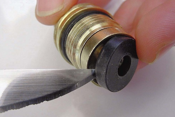 Le bord résultant de l'augmentation du Ø doit être finalisé: couper le long de la circonférence du côté de contact avec le siège à un angle de 45 °, de sorte que ce scellant "s'insère" fermement dans le trou bouché et que la valve avec un nouveau joint ne fredonne pas.