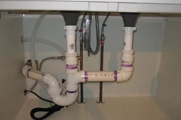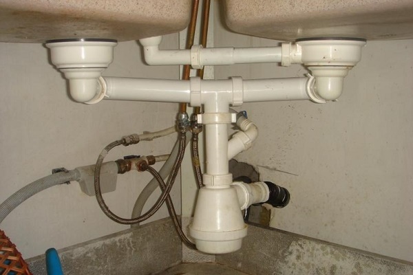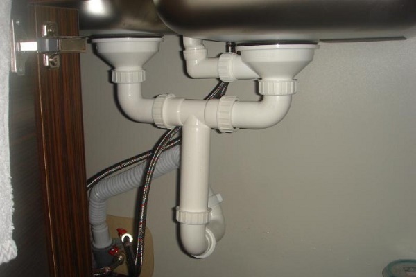 Le siphon utilisé pour connecter le double évier a une sortie vers deux tuyaux de vidange. Deux ballons d'obturation d'eau installés séparément sont interconnectés à l'aide d'un té spécial. Ce té est connecté avec une ondulation flexible ou un tuyau rigide au système d'égouts.