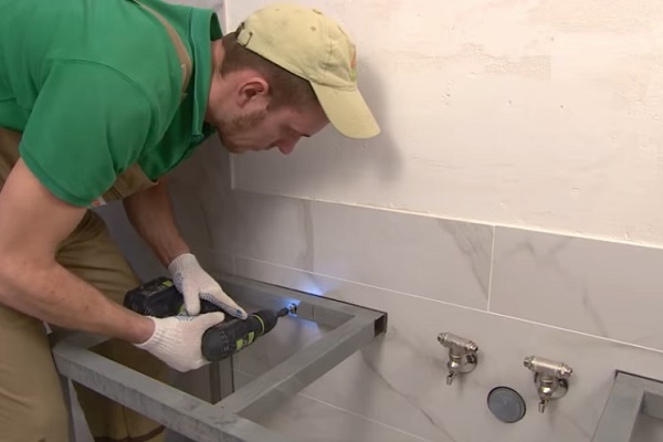 Des trous sont pratiqués dans le mur pour l'installation de chevilles à expansion, dans lesquelles ils vissent ensuite des vis autotaraudeuses de plomberie. Le bol est mis sur les vis qui dépassent du mur et monté sur un piédestal.