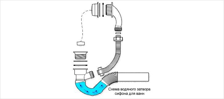 Le secret principal de la fonctionnalité de siphon dans sa conception. En raison de la flexion, l'eau ne quitte pas complètement le tuyau. Serrure à eau formée et agissant comme une barrière à la pénétration des égouts "ambrés" dans le trou de drainage.