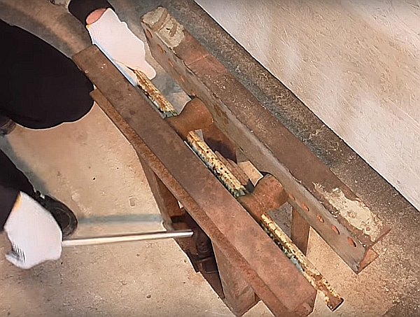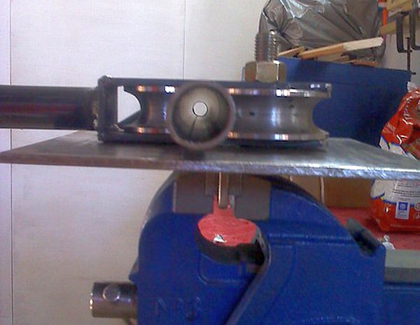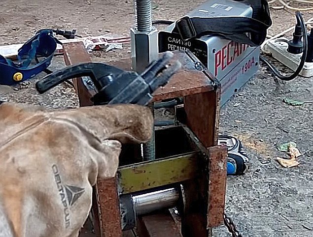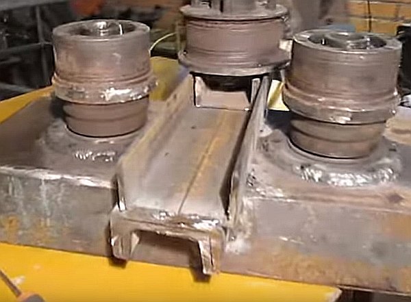 Après avoir assemblé la structure, vous pouvez poser le tuyau sous les rouleaux et le presser au centre avec une buse semi-circulaire à l'aide d'un cric.