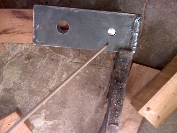 - Prenez les plaques métalliques percées de 15x6 cm, un boulon de 0,5 pouce, un petit rouleau, une bande d'acier de 35 x 60 mm et soudez-y une structure en forme de «P», après avoir inséré le boulon avec le rouleau dans les trous correspondants.