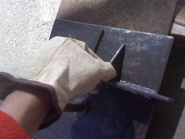 Aux bords du canal de guidage, des bandes ou angles sont soudés pour limiter les mouvements verticaux de la partie mobile de la structure. Le bord de la rainure principale est fermé par une tôle avec un trou pour la vis de serrage. De l'autre côté de la plaque, une poignée de porte est soudée à la vis.