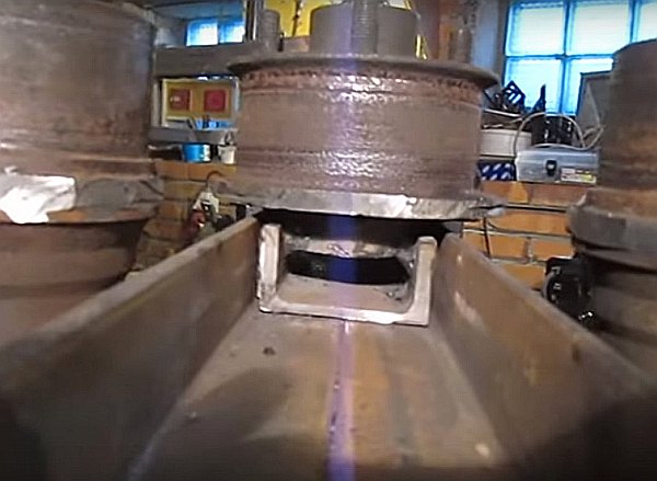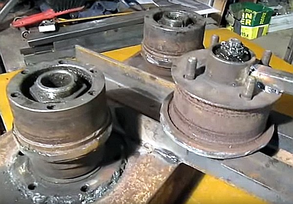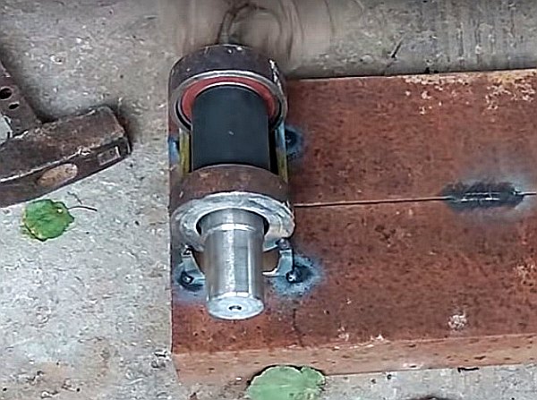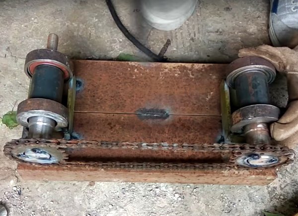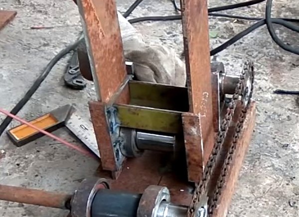 - Mettez des roulements sur les arbres et soudez deux de ces structures à la base. Il est conseillé de limiter les arbres avec des bandes métalliques ou de les placer dans la cavité intérieure des canaux.