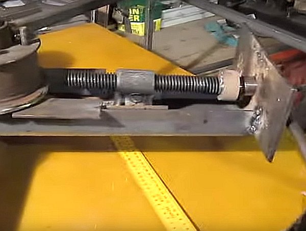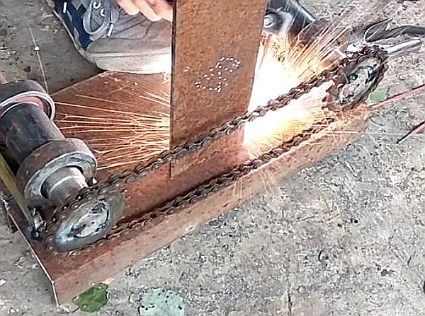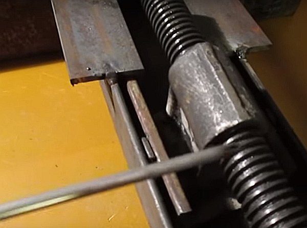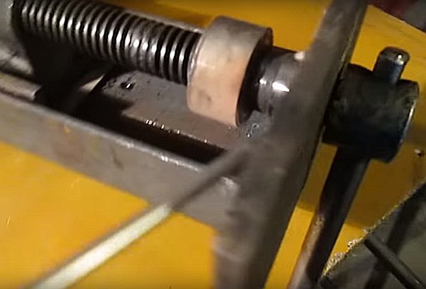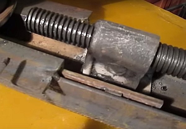 Entre les moyeux se trouve un canal de guidage immobile, qui peut être soudé à partir de deux coins. Un canal plus petit est situé à l'intérieur de la structure de guidage, un troisième moyeu à axe rotatif est soudé à un bord du canal, et un écrou ou un manchon fileté pour le boulon de pression est soudé au second.