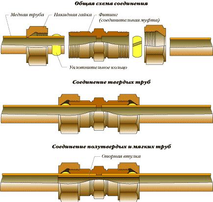 La connexion des tuyaux en cuivre dans un seul système est réalisée par analogie avec les produits en acier et en métal-plastique, mais avec l'utilisation de raccords spéciaux - laiton, cuivre et bronze.