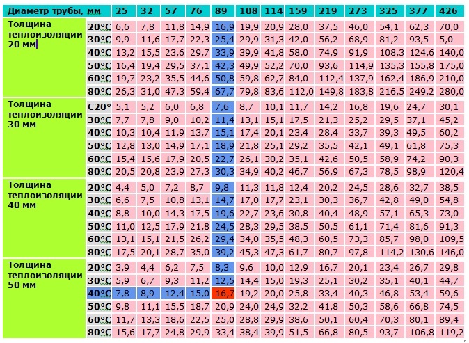 Utiliser le tableau pour choisir la bonne option est un peu plus facile. Pour ce faire, vous devez d'abord connaître le diamètre du tuyau et l'épaisseur de l'isolation, ainsi que la différence estimée entre la température de l'air et le contenu du pipeline. Ce dernier indicateur peut être trouvé en utilisant des données de référence selon la région.