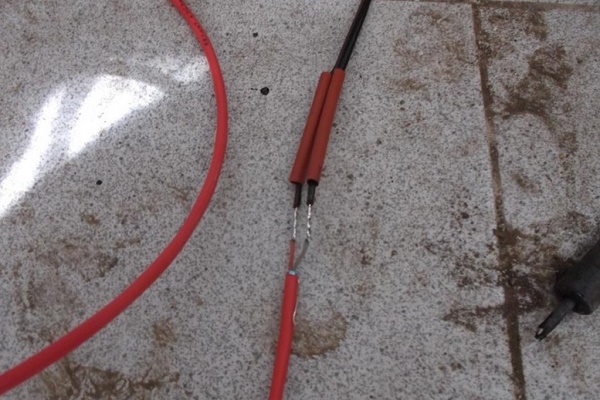Maintenant, les extrémités des câbles des éléments chauffants et de l'alimentation sont connectées dans un tube thermorétractable équipé d'un manchon métallique. Il est chauffé et serré, le point de contact est enveloppé avec du ruban thermique, puis fermé avec un autre tube de protection.