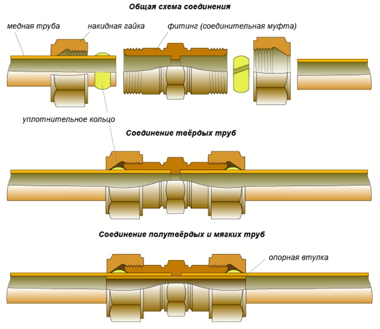 D'une seule pièce - c'est une connexion en appuyant sur. Le cuivre étant très ductile, l'installation s'effectue à l'aide de raccords à sertir et de manchons à sertir. En termes d'étanchéité et de résistance, une telle connexion peut être comparée à la soudure, et elle est plus durable que la compression.