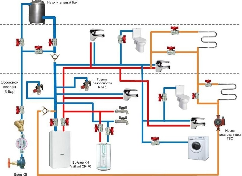 Le plus souvent, le schéma de câblage classique est utilisé, du même type en ce qui concerne les conduites d'eau froide et d'eau chaude.