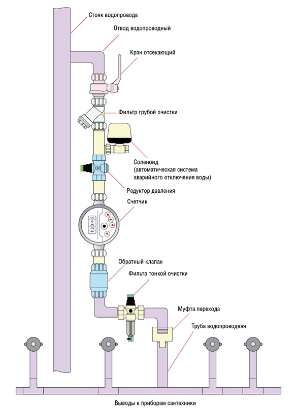 L'eau est fournie par la colonne montante de la conduite principale centralisée par une décharge de tuyau avec un robinet d'arrêt installé dessus. Ensuite, les éléments du système sont montés en série: filtre, boîte de vitesses, compteur, clapet anti-retour et connectés au collecteur de distribution.