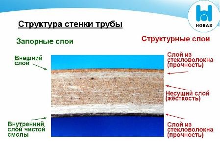 Société suisse Hobas technique de formage centrifuge développée et brevetée. Dans ce cas, la production s'effectue de la paroi extérieure du tuyau à la paroi intérieure en utilisant une forme tournante. La composition du pipeline comprend: des câbles de verre concassé, du sable et des résines de polyester.
