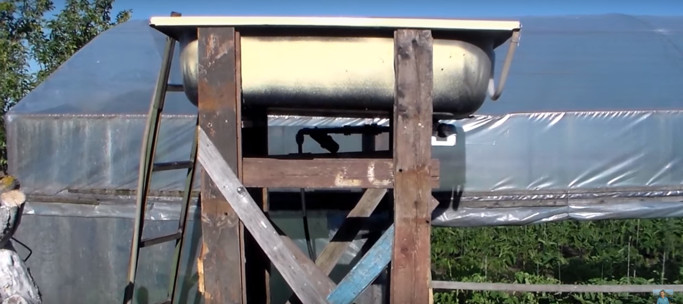 Et dans la serre, c'est déjà plus facile: la plupart d'entre eux sont installés en permanence, mais si nécessaire, le système est facilement mis à niveau ou déplacé. En tant que conteneur, j'utilise un vieux bain en fonte (pour les serres), pour un jardin en plastique - Eurocubes.