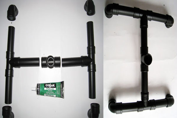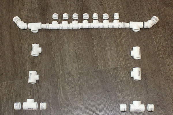 Afin de simplifier le processus d'assemblage, vous devez répartir toutes les pièces en groupes: ébauches pour la base, pour les branches (bras de suspension) et pour le rack. Le premier groupe comprendra: 4 articulations du coude, 3 tés et 6 tubes de 12 cm chacun.