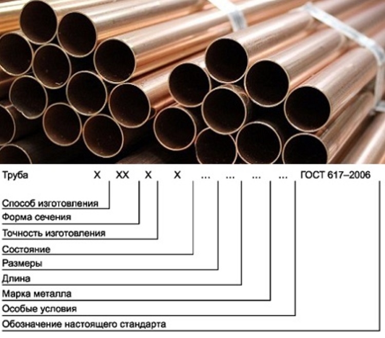 Les paramètres externes, les caractéristiques mécaniques, la composition des alliages, l'assortiment et les désignations de marquage sont régis par deux dispositions principales: GOST 617-2006 (Tuyaux en cuivre à usage général) et GOST 11383-75. Les produits de fabrication européenne se rencontrent norme EN-1057 de 2006.