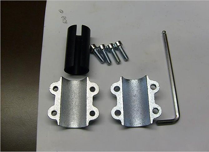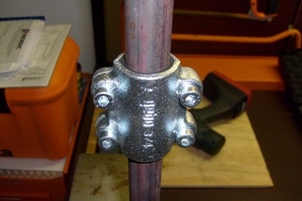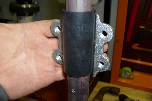 Le support fini ne reste qu'à attacher le tuyau au bon endroit, reliant les oreilles ensemble au moyen de boulons. Un collier de serrage est fixé au mur.