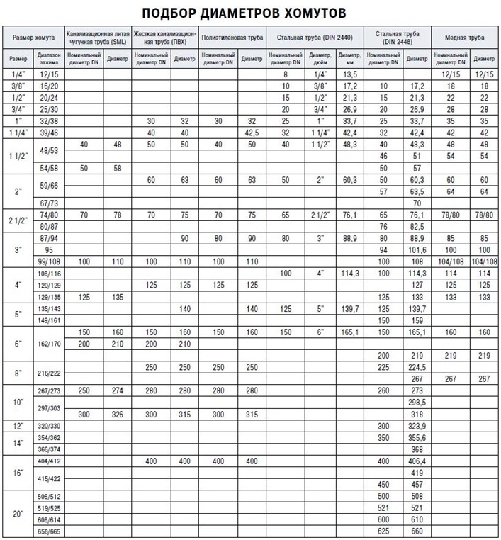 Les colliers de fixation sont conçus pour des tuyaux de presque n'importe quel diamètre. La gamme de diamètre des attaches disponibles à la vente est de 14 à 540 mm. Pour simplifier la tâche de choisir la dimension du produit aidera le tableau ci-dessous.