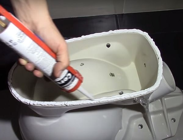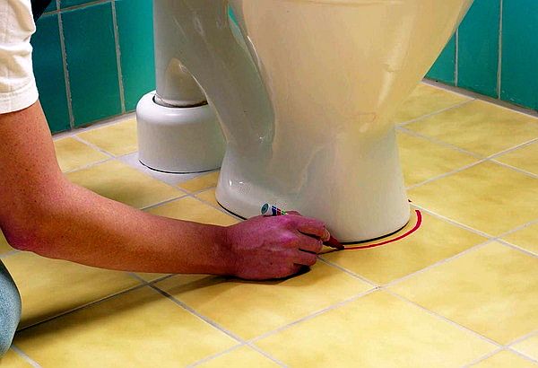 Étape # 6: application silicone. Le mastic est extrudé avec une bande de 3 à 5 mm sur le bord inférieur de la cuvette des toilettes ou à un endroit approprié sur le carreau. Son excès peut être éliminé ultérieurement avec une spatule en caoutchouc.