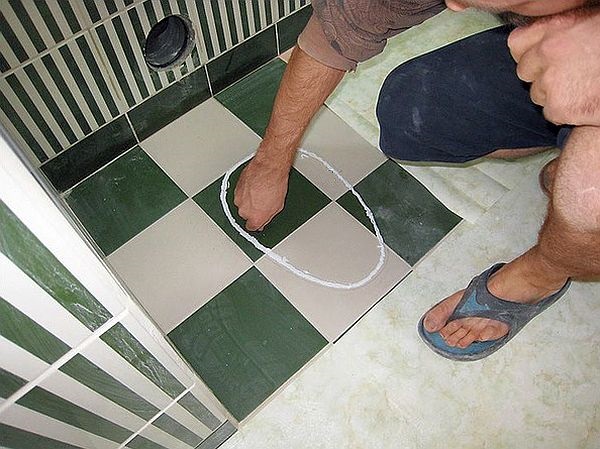 Étape 1: marquage de l'emplacement de la plomberie. La toilette est placée dans un endroit constant et est entourée d'un crayon ou d'un marqueur. Ensuite, l'appareil est retiré.