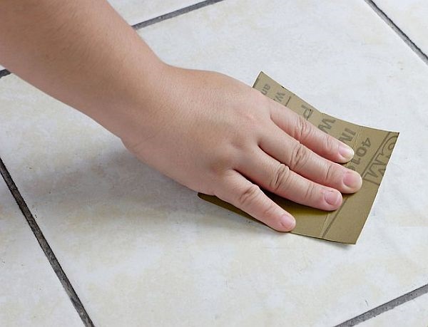 Étape 2: préparation du sol. La surface en céramique lisse du carreau a de mauvaises propriétés adhésives.Par conséquent, pour augmenter l'adhérence, il est recommandé de traiter le sol au point de contact avec du papier de verre. Après cela, la surface est soigneusement lavée et séchée.