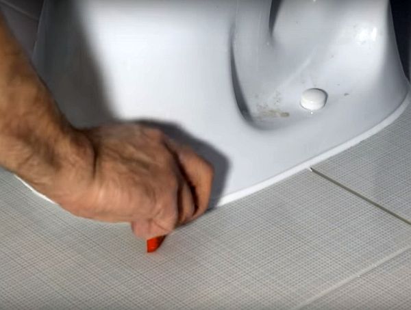 Étape # 10: enlever l'excédent de silicone avec une spatule en caoutchouc et couvrir les interstices entre le sol et les toilettes avec un mastic.