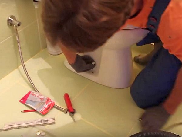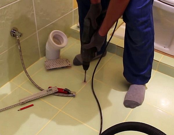 Étape 1: marquage des trous. Au départ, les toilettes se renversent et les supports sont essayés. Ensuite, la plomberie est placée sur le sol et un crayon sur la tuile marque l'endroit en face des trous de montage. Ensuite, les supports sur les marques sont placés sur le sol et des endroits désignés pour le forage.