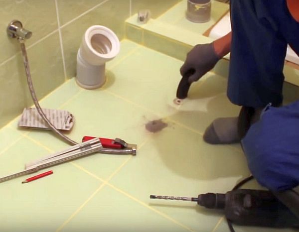 Étape 2: perçage du sol. Tout d'abord, une encoche sur la tuile est faite au centre du trou proposé avec un noyau et un marteau pour mieux positionner le foret. Ensuite, vous pouvez commencer à percer. Tout d'abord, un vrille est utilisée sous la forme d'une plume pour les carreaux de céramique, et après y avoir pénétré - un foret pour le béton.