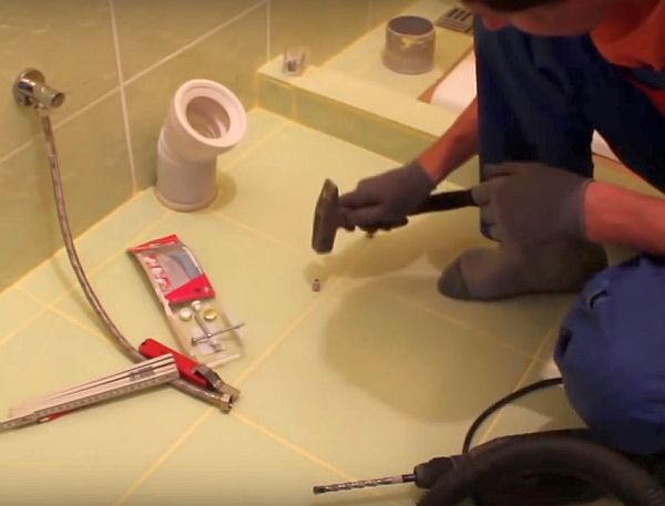 Étape # 5: chevilles de conduite. Leur bord supérieur doit être en dessous du niveau de la tuile de sorte que les toilettes soient directement sur le sol. Pour la conduite, il est conseillé d'utiliser un maillet, mais vous pouvez le faire avec un marteau.