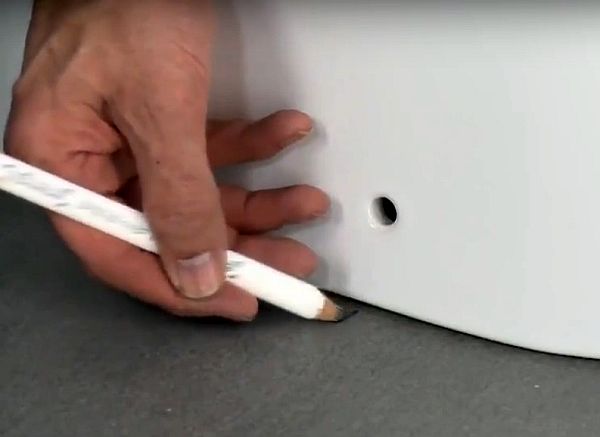 Étape 1: marquage des trous. Elle est réalisée des deux côtés par des mouvements de rotation d'un crayon ou d'un marqueur dans le trou correspondant des toilettes. Il est également nécessaire de faire plusieurs marques sur les bords afin de pouvoir ensuite mettre en place l'appareil avec précision.