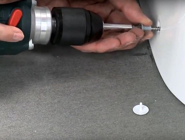 Étape # 9: fixation des toilettes. Boulons insérés à travers les trous latéraux, l'appareil est fixé aux supports. Des bouchons décoratifs peuvent être inclus, qui sont ensuite portés sur des bouchons à vis.