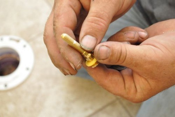 - Des bouchons en plastique sont enfouis dans les trous. Les toilettes sont "hissées" à leur place d'origine. Les boulons sont vissés dans les trous préparés.