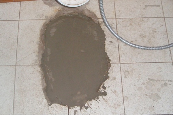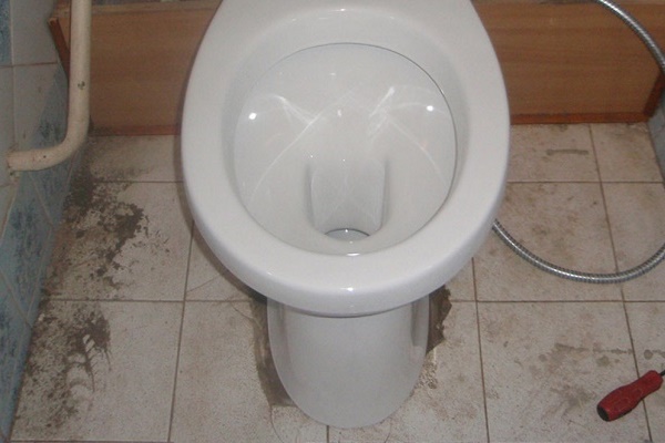 - Les toilettes sont poussées sur le côté. Des trous d'un diamètre égal à la taille des chevilles utilisées sont percés aux points désignés avec une mèche diamantée.
