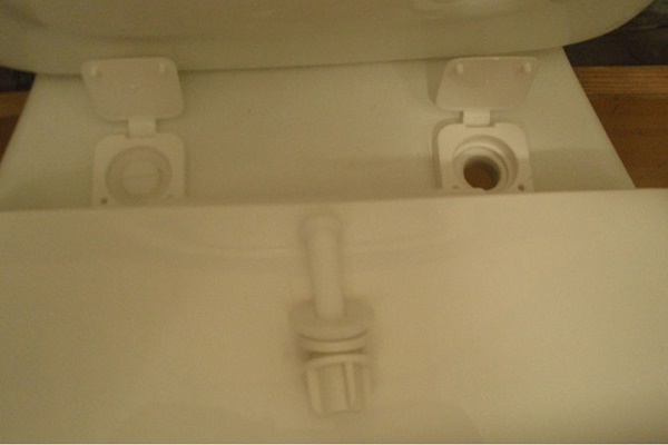 - Un réservoir équipé d'un mécanisme de vidange est fixé à l'étagère du bol. Les éléments sont fixés avec des écrous et des boulons, après avoir mis des rondelles et des joints en caoutchouc sur les fixations.