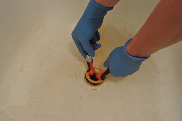 La dernière étape préparatoire reste - le démontage du drain. Si cela n'est pas fait, l'excès d'acrylique tombera dans l'égout et y gèlera, ce qui peut causer des dommages. Un petit récipient inutile est placé sous le trou pour recueillir la composition renversée.