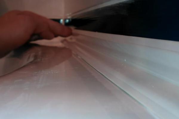 - Lissez soigneusement le rouleau résultant avec une spatule ou un doigt spécial afin que ses bords fusionnent avec les surfaces de travail. Humidifiez un doigt avec de l'eau savonneuse afin que le scellant ne s'y colle pas.